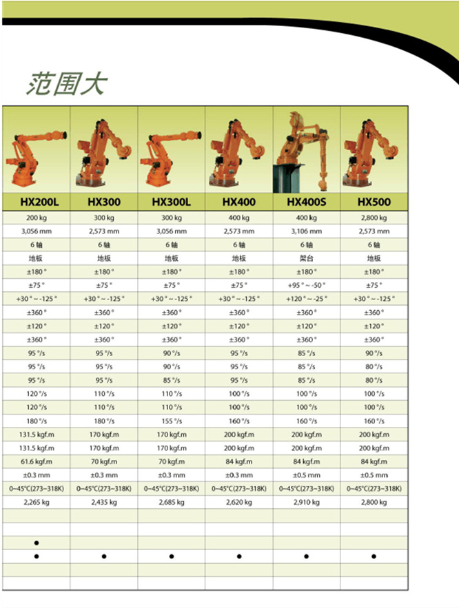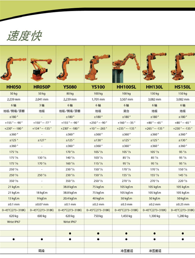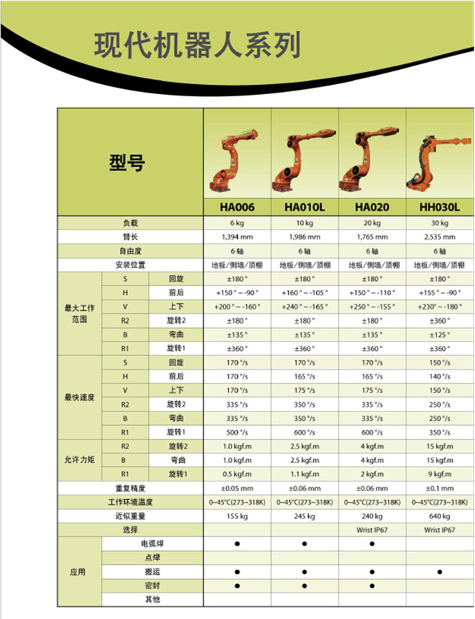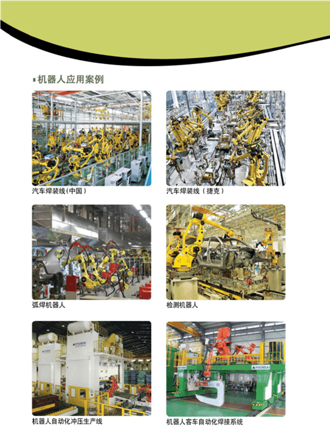 直角坐標型工業(yè)機器人 、 圓柱坐標型工業(yè)機器人、 圓柱坐標型工業(yè)機器人 、多關(guān)節(jié)型工業(yè)機器人、平面關(guān)節(jié)型工業(yè)機器人。弧焊機器人、 激光焊機器人、電阻焊機器人、自動化焊接機器人、點焊機器人、等離子切割機器人、清潔機器人、上料機器人、物料輸送機器人、材料去除機器人、包裝機器人、噴漆機器人、自動鉆孔機器人、堆跺機器人、涂層機器人、去毛刺機器人、磨銷機器人、高溫噴涂機器人等。